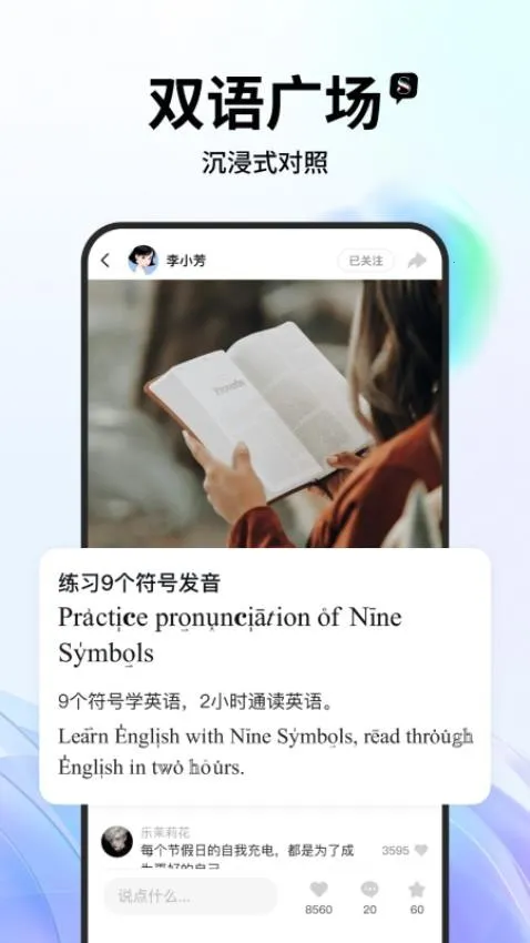 See社交翻译软件特色丰富。**更多乐趣**让交流更精彩,助你更好与对方互动。**聊天互动**多样,提升聊天效果。**精准识别**开启精准翻译模式,翻译准确。**无障碍沟通**与外国友人交流轻松。**智能翻译**实现智能精准翻译,能翻译更多内容。基于即时聊天通讯系统的双语实时翻译技术,营造双语交流环境助学习。还有中英文演说家大赛等平台,以及9个符号注音系统、双语广场等特色,助力用户在社交中学习英语、轻松交流。