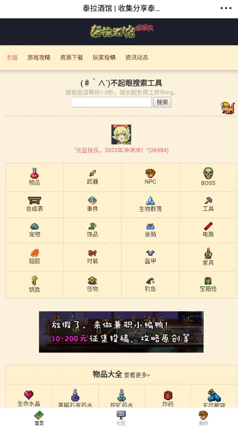 如果你是泰拉瑞亚玩家,泰拉酒馆绝对是个超棒的软件。它能帮你轻松解决很多游戏里的难题。在这软件里,各种游戏道具、NPC、BOSS合成表都能在线查找,还有超全的游戏攻略供你查看。不管是武器图鉴、攻略查询,还是视频观看、社交互动,它都能满足你。你能通过它了解最新玩法和攻略,比如武器的最优搭配方案、获取途径以及伤害数值计算方式等。它还支持离线使用,对电脑玩家很友好。有了它,你就像有了个游戏小助手,能随时查询全物品合成配方、怪物及BOSS掉落物品清单、NPC详细信息等核心数据。而且社区板块能让你和其他玩家交流互动,分享心得,还能展示游戏成就。总之,泰拉酒馆能让你在游戏中更得心应手,轻松享受游戏乐趣。