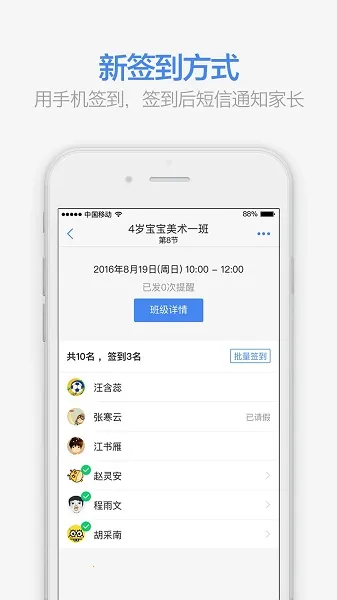 1. 手机点名超便捷:可在手机上轻松给学员点名,点名后能自动短信通知家长,学员的出勤情况一目了然。