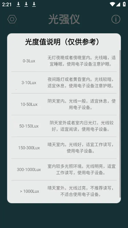 在摄影曝光控制、室内照明优化、建筑采光设计等方面,光强仪都能发挥重要作用。用户反馈该应用测量结果准确可靠,趋势图展示清晰直观,能够有效辅助各类光照相关决策。同时,其轻量化设计不占用过多手机资源,运行流畅稳定,进一步提升了用户体验。如果你有光照强度测量的需求,不妨试试这款光强仪。