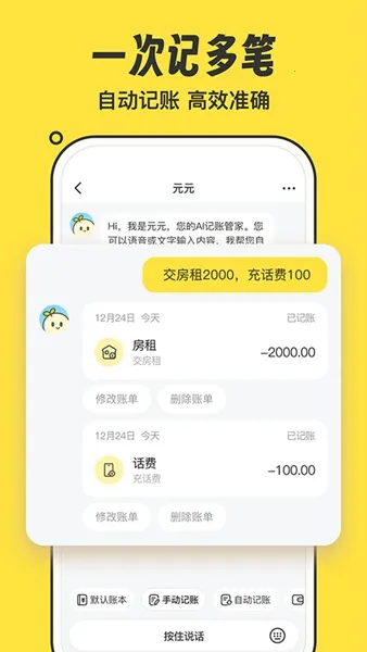 元元记账是手机记账软件,借助强大AI技术提供高效财务管理。支持语音、文字、手动记账,语音记账可录多笔消费自动生成账单并智能归类。还内置资产管理功能,可同步多账户信息,满足多种记账场景需求。