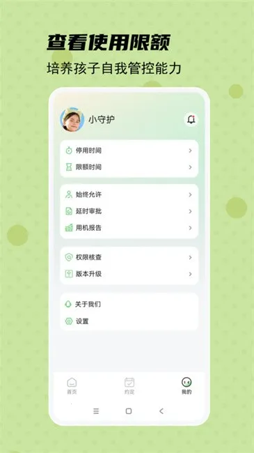 守护宝孩子端是一款能帮助家长管控孩子手机使用的软件。它能精准管控限制应用,避免手机因过度管控影响正常功能。有时间管控功能,可设置停用时间,防止孩子在休息学习时用手机;限额管控能与孩子沟通设置应用可用时长,培养自我管理意识。安装管控可防止孩子安装不健康应用,保障绿色上网环境。还有实时定位能获取孩子位置保安全,约定功能可设目标给奖励,引导孩子养成好习惯,实时便签能推送提醒,花销统计可防孩子随意充值游戏,微信QQ管控能单独限制进入相应小程序,同屏监管可0延迟查看孩子手机使用情况。新版特性中限额时间增加停用时段,能更灵活地进行分类或APP禁止使用时段的单独设置。若你想取消守护宝孩子端对应用的限制,可在软件中找到相关设置选项,根据自身需求进行调整,轻松满足你的个性化管控要求。