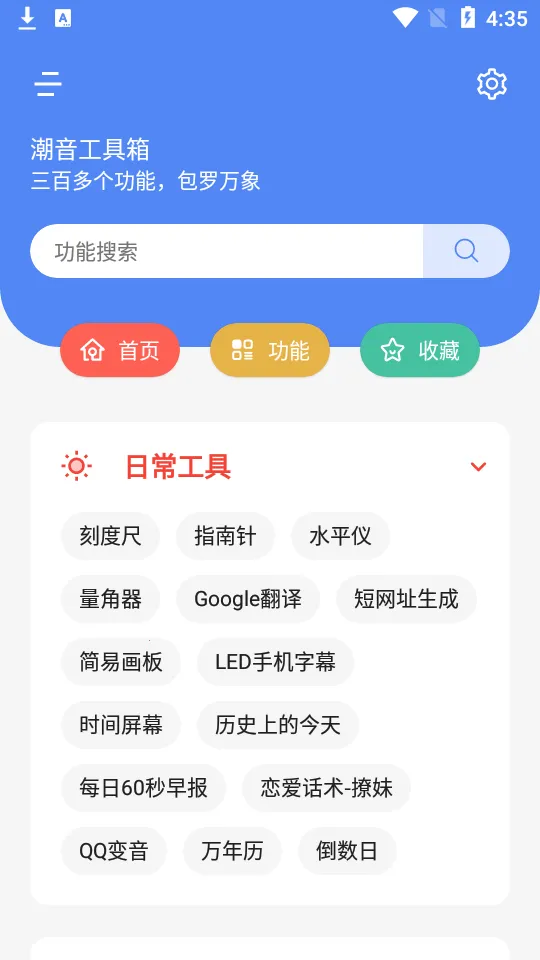 潮音工具箱安卓版是实用手机端工具箱,内置三百多个工具,涵盖日常计算、图片编辑等。可关键词搜索,按类分类,支持收藏。无广告,免费使用,能保护隐私,还能提取网站资源,操作简单便捷。