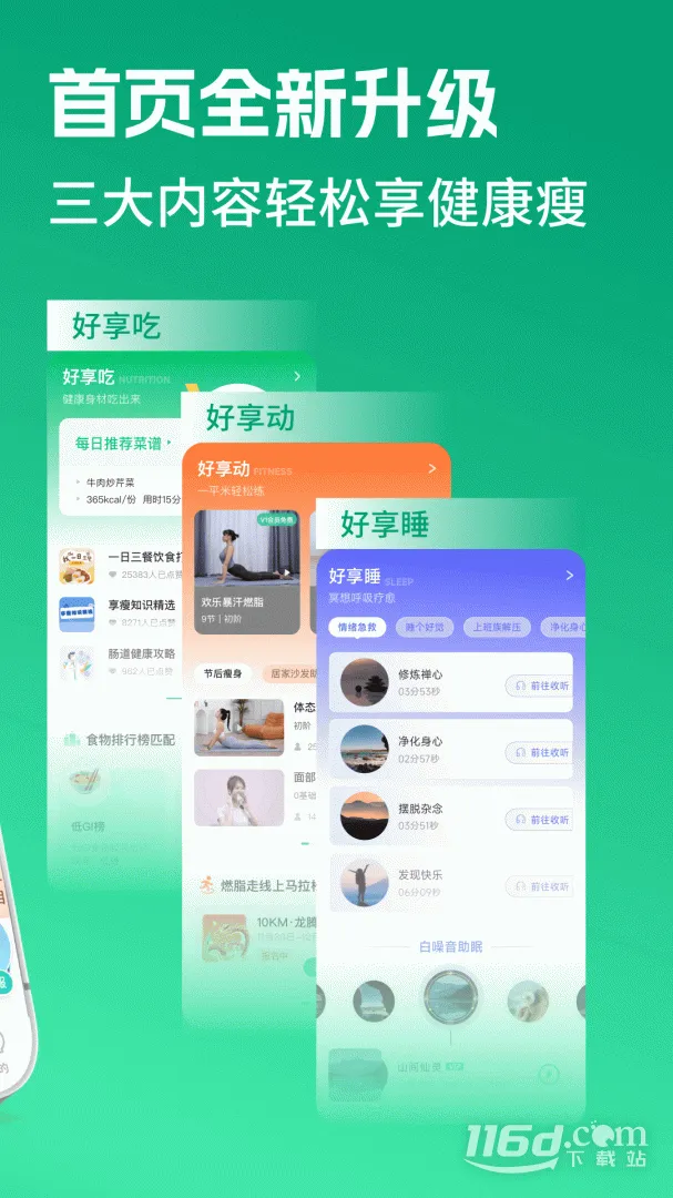 好享瘦是绿瘦的用户体重管理和会员服务平台,可记录分析体重、运动、饮食和睡眠,智能设备链接测评15项身体数据。提供定制瘦身方案,还有丰富会员权益,助用户科学变瘦变美变健康。