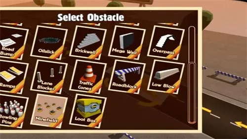 车祸英雄中障碍物的种类有15种,玩家可以根据自己的需要和喜好进行选择,只有合理地放置障碍物的位置,才会得到更高的分数。比如在下图中,在车量多的公路路口处,小编放置的是机油,这样放置可以让车子在路口处让车子打滑,使车子更容易进入进入该公路路段,从而与其他来往车辆相撞,得到高分。另外,在某些特殊的场景中,玩家要是能运用好加速、跳板和地雷等障碍物,可以在特定情况下起到意想不到的效果。