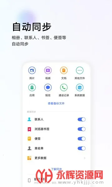 3、便捷分享:可将数据与好友自由分享,包括文本、日程、图片、视频、音乐、书签、联系人、记事本、手机应用等,随时随地分享给朋友。