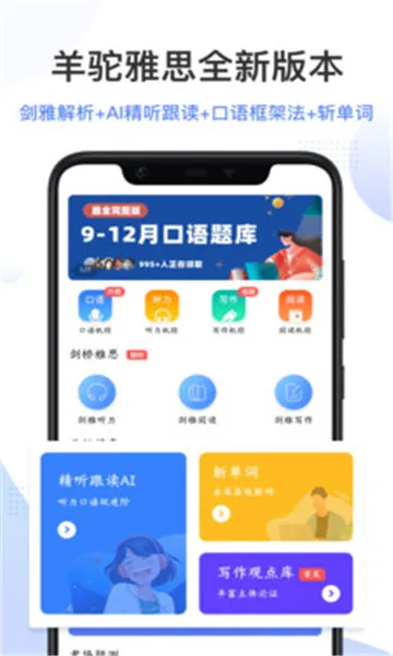 羊驼雅思2025官方正版是专为雅思考生打造的备考软件。提供丰富学习技巧、全面考试辅导,有庞大题库与多种练习模式。能定制学习计划,含智能推荐、阴影训练、精准预测等特色功能,助考生高效备考、提升成绩。
