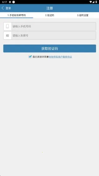 3、没有账号的各位,进入注册板块,提交手机号、车牌号等信息;