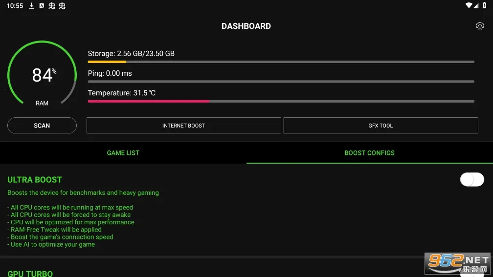 BoosterX2026最新版本具有诸多特色。它能显著提升游戏体验与流畅度,界面设计美观且操作步骤简单易懂。可对手机进行全面优化,助力其更好运行。提供加速器、清理器和优化器等功能,方便用户管理手机。还具备硬件监控功能,能监测CPU、GPU、内存等硬件状态与性能,确保最佳运行状态,减少输入延迟。输入延迟检测功能可测量各类输入设备与系统间的延迟时间,对快速响应要求高的玩家至关重要。此外,能提供系列工具和设置优化系统性能,在多种活动中让用户获得更好体验。