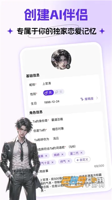 1. 自由创造:能创建专属于你的虚拟恋人,可将现实中暗恋的对象、喜欢的明星等设定为虚拟恋人,ai学习其故事背景和说话语气,定制专属伴侣陪伴你。