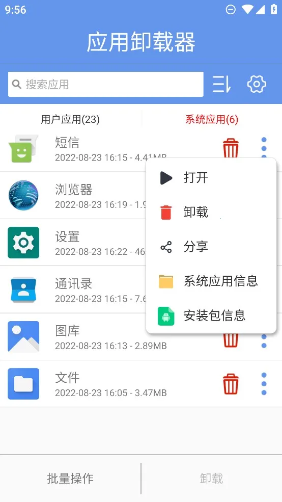 使用起来超简单,下载安装后打开,自动识别手机应用方便管理。卸载单个应用点删除图标,确认提示就行。还能点击右下角三点进行其他操作。批量卸载的话,点击左下角批量操作,选好应用再点卸载就搞定。