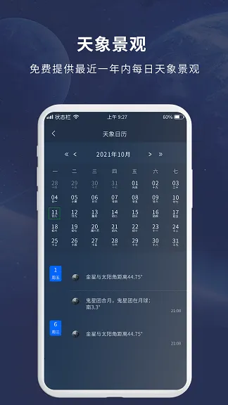 1、免费提供丰富天象数据:免费提供最近一年内每日天象景观,免费晴天钟数据,让观星更轻松,还能免费获取空间站可见过境时间、方位、高度等信息。