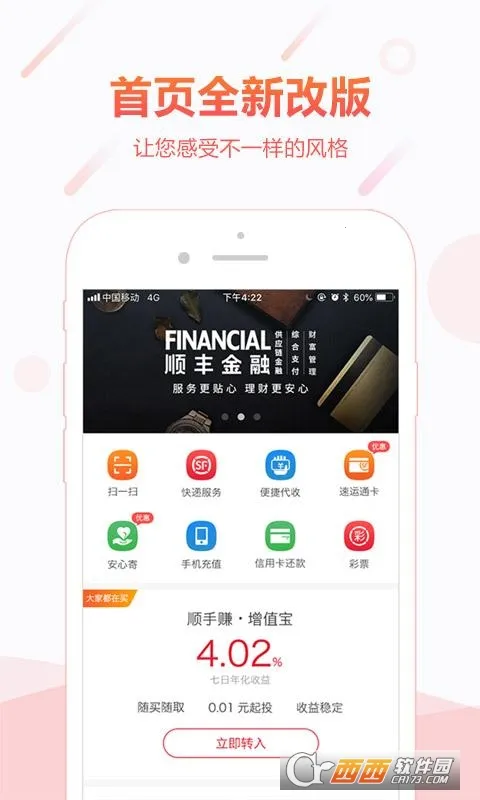 顺丰金融不断升级,为用户带来更好体验。它涵盖支付转账理财等功能,是综合金融信息服务平台。其理财品类丰富,活期、定期、基金、浮动收益等应有尽有,能满足不同层次用户投资需求。配套风险测评等投资者教育内容,新手也能轻松上手。操作便捷,手机就能轻松购买理财产品,免去繁琐手续,节省时间精力。还提供生活服务,购物、快递、手机充值等一站式搞定。安全方面也有保障,致力于提供定制化金融服务,让用户的金融生活更高效、便捷、丰富,值得下载体验。