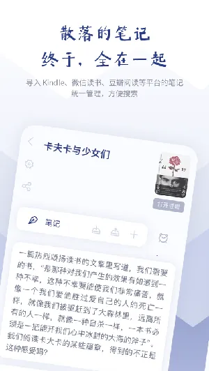 众山小读书笔记软件超棒!它能帮咱们快速做笔记,高效记录各种文本。学习时用它记重点,能更好地梳理和重温内容,还能培养写作习惯。软件特色突出,能解决多平台笔记分散难题,汇总笔记方便查找。统一编辑让数据更可视化,还能记录阅读轨迹。亮点也不少,能记录每天阅读时间,生成阅读页数和时长统计表,年底还有年度阅读总报。它支持文字、图片等多种笔记形式,能一键导入其他平台内容生成新笔记。用法简单,首页可直接添加笔记,书架模块能添加书籍并标记阅读情况。登录账号后,内容云端保存,换设备也能查看。真的很适合重度阅读爱好者,能帮咱们快速预览阅读内容,合理管理知识,清晰回顾笔记,提高阅读效率,合理利用时间。