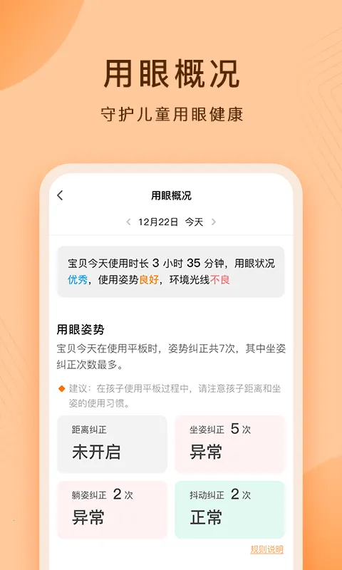 1. 用眼习惯全掌握:通过护眼平板 APP,能清晰了解孩子用眼习惯、姿势及环境光线,提供科学使用环境。