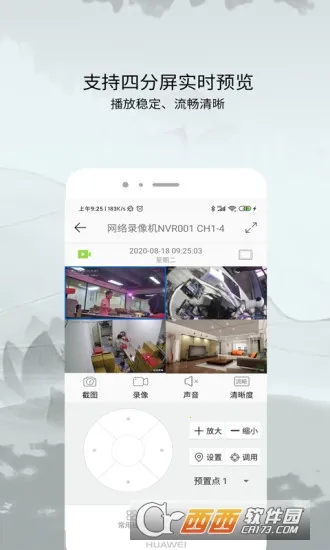 功能丰富实用:具备录像回放、文件查找智能排列、实时对讲、智能报警、四分屏预览等功能,操作简便,播放稳定流畅清晰。