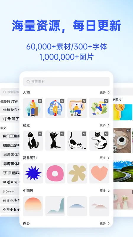 2、海量资源支持:拥有海量原创设计模板、300款正版字体、6w个矢量素材、大量高清图片,正版保障,为设计提供丰富素材。