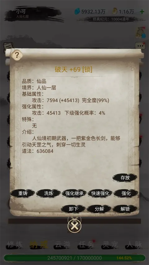 3、进阶重生机制:可以通过进阶重生机制实现指定属性的无限成长,全方位拔高角色的修仙实力。
