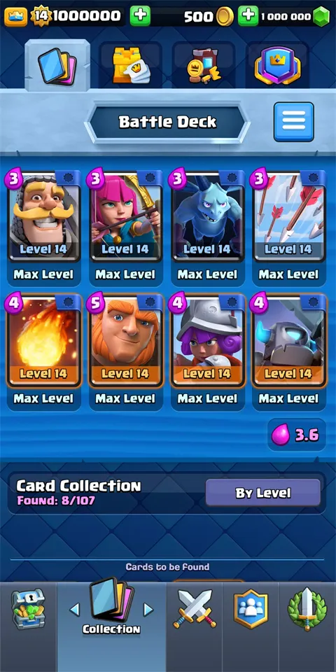 3、多样玩法体验:选择8张牌组对战,战场双线,要兼顾两条线状态。能实时挑战全球玩家夺奖杯,赢宝箱解锁奖励、升级卡牌,摧毁敌军塔楼赢皇冠和史诗皇冠宝箱等。