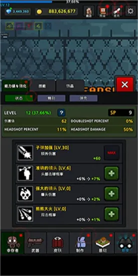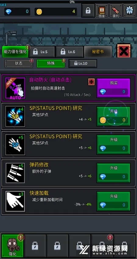 3. 角色养成有趣味。消灭僵尸得经验升级获SP强化攻击力,属性可自由分配,还有各种独特皮肤,收集解锁能换装束并获额外加成。