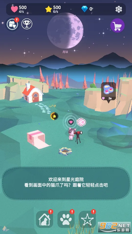进入游戏后跟着引导点击猫爪互动。爱心可召唤新小动物,成功召唤后了解它们喜欢的玩耍庭院来经营布置。还能获取装备给管理员配备,在商城买道具。游戏特色满满,有晴雨风雪天气变化和不同色彩夜空,能边玩边学星座知识,每天查看星座运势。亮点也不少,收集可爱小动物放松心情,为角色搭配装备更出色,还有数十种相机滤镜记录分享美丽夜空庭院。而且它有AR功能,能欣赏真实星空,给你带来很棒的养成体验,快来试试吧!