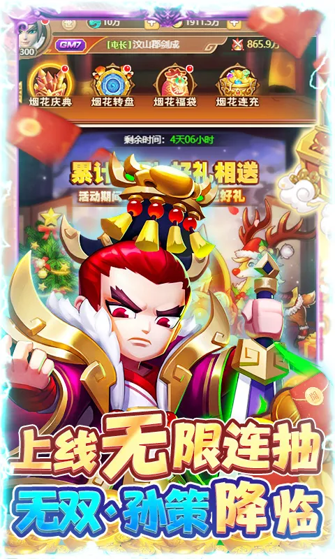 2. 丰富福利体系:如每天登录免费领取648代金券,可购买所有礼包;每日签到领充值卡、五星武将等豪礼;开局送GM装备,升级领万元充值卡,完成任务也能领充值卡,新服福利满满。