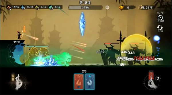 进入游戏后,点击右下角闯关。角色自动战斗,右下角会随机生成不同属性和品质的符咒,拖动到场上就能释放,对敌人造成伤害或控制。每个关卡最后一波有首领怪物,可通过局外天书技能造成大量伤害。